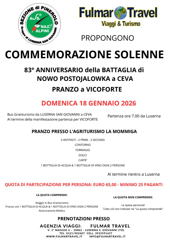 Anche noi ne faremo parte esponendo il tricolore. Vi ricordiamo anche il viaggio che la Sezione di Pinerolo e gli amici del gruppo di Luserna San Giovanni faranno domenica 18 gennaio farà a Ceva per ricordare questo importante avvenimento. Ecco la locandina.